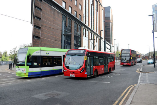 In this latest edition of “Trams &” we go to the London Trams system and see a tram with not one but two buses.