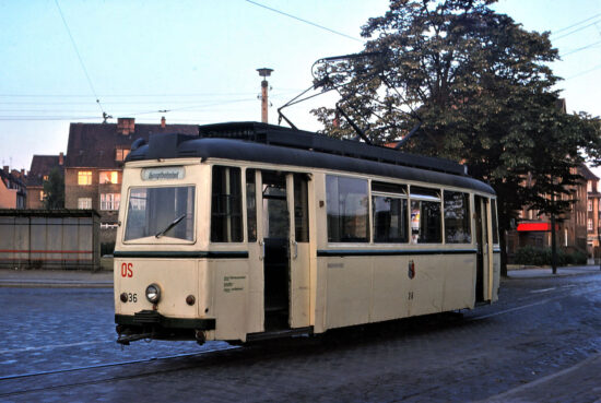 This photo shows ET54 four-wheeler 36, which was built Gotha in 1956. It waits optimistically for custom outside Halberstadt Hauptbahnhof, where it doesn’t look as though there is going to be an evening rush. The Gothic lettering on the destination blind, the lack of route number and the street paved with setts or blocks all contribute to the small-town atmosphere. Happily 36 still survives in Halberstadt today as a museum car. The town has almost as many trams in its historic fleet as it owns to run the daily public service.