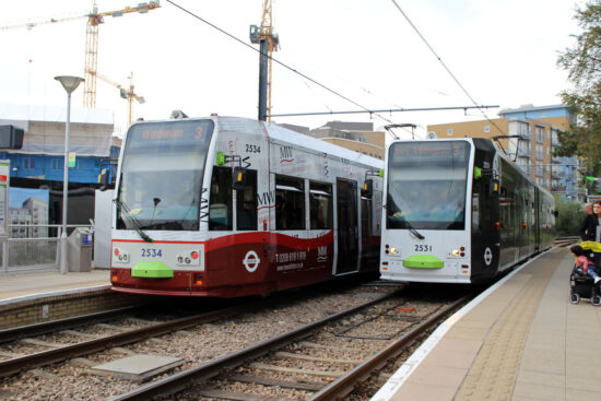 The two trams we see here are both in advertising liveries, and they are advertising liveries for the same firm of solicitors! The left hand side tram is 2534 which is in the older design for McMillan Williams solicitors, and it’s a colour scheme which gives vibes of the original Tramlink livery of red and white. Then we also see 2531 which is in a darker design. 2531 carried this advert September 2014-November 2015 and 2534 from May 2013-December 2015. The location is Wandle Park. (Photograph by Gareth Prior, 23rd September 2014)