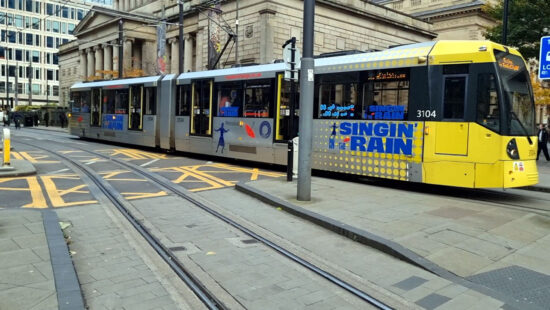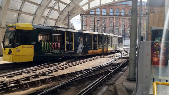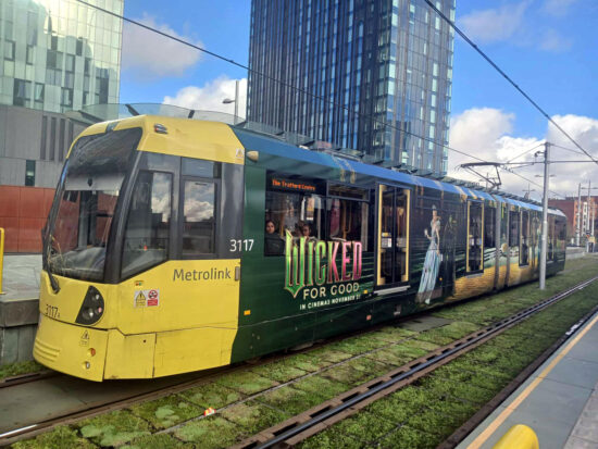It’s the week of the musical on Manchester Metrolink as it becomes the second UK tramway to start advertising the Wicked: For Good movie (two trams for Metrolink as well as on the West Midlands Metro), whilst a musical from a much earlier era is also seen with a partial advert for the new production of Singin’ In The Rain at the Royal Exchange Theatre. The three trams to receive these latest vinyls are 3101 and 3117 (Wicked: For Good) and 3104 (Singin’ In The Rain).
