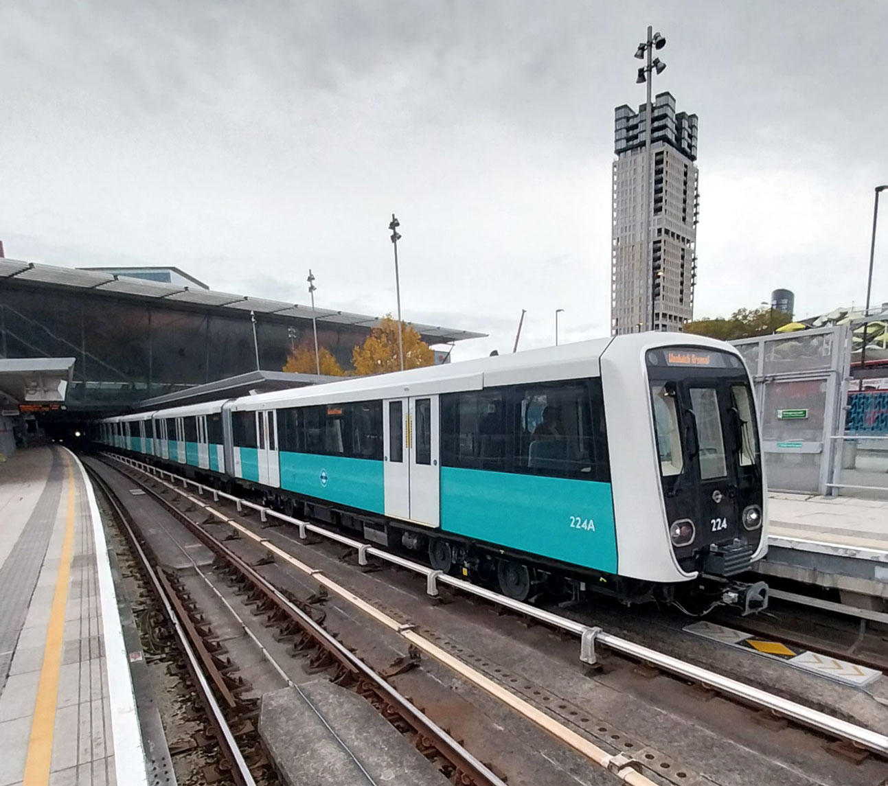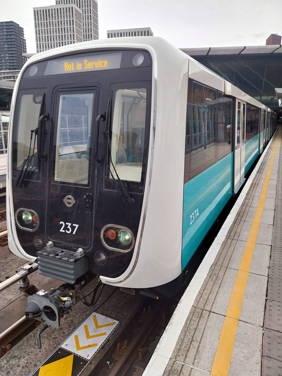 The first of the new B23 units – being built by CAF – entered service on 30th September 2025 when 209 carried passengers on the Woolwich Arsenal to Stratford International route. 209 remained the sole example to be used in service for a few weeks, on a solitary diagram, whilst others continued to be used on test from Beckton to Stratford International.