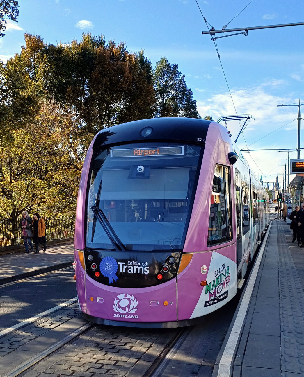 It may be late October but the sun is shining on Princes Street as we take a look at the last of the CAF built trams, 277, pausing at the island platform on the way to the Airport. The tram is now advertising Scottish Rugby and is mainly promoting the Scottish Women’s ruby team playing a forthcoming match against England (April 2026) at the main Murrayfield Stadium instead of the smaller The Hive (alongside the stadium). (Photograph by Roy Calderwood, 28th October 2025)