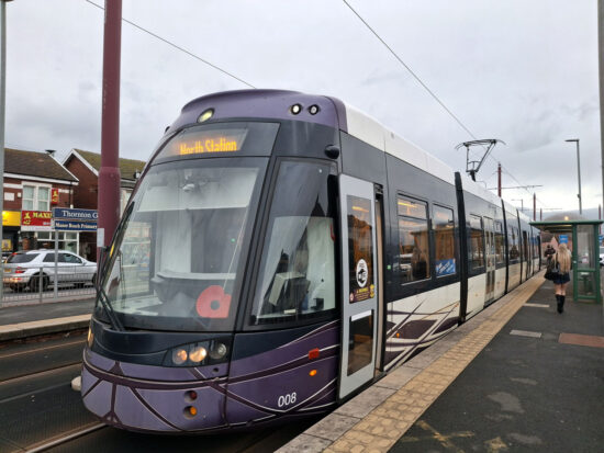 008 calls at Thornton Gate with a Fleetwood Ferry-North Station service. Poppy in the drivers cab and no adverts on the exterior of the tram. (Photograph by Oliver Shenton, 4th November 2025)