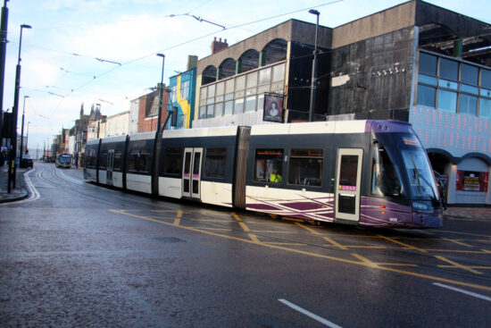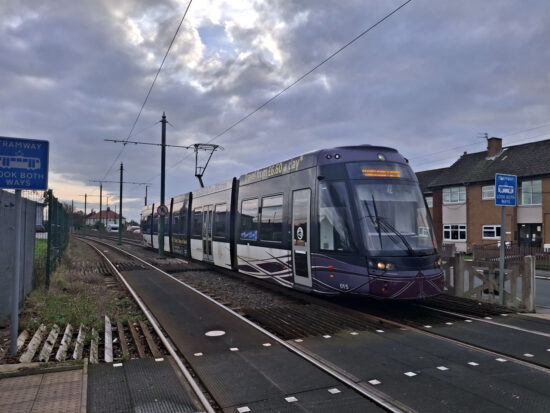 Welcome back to service 015! On the way to Fleetwood Ferry the tram is seen here showing its internal external adverts still in place. (Photograph by Oliver Shenton, 5th November 2025)