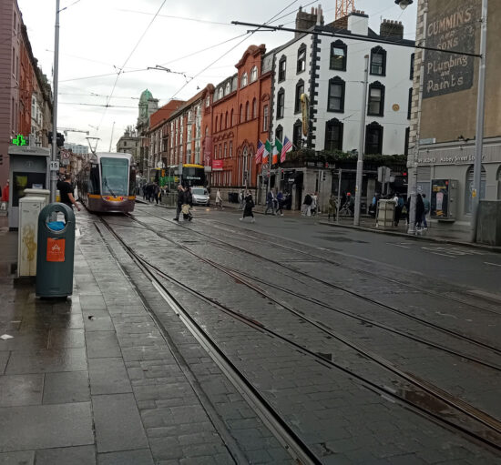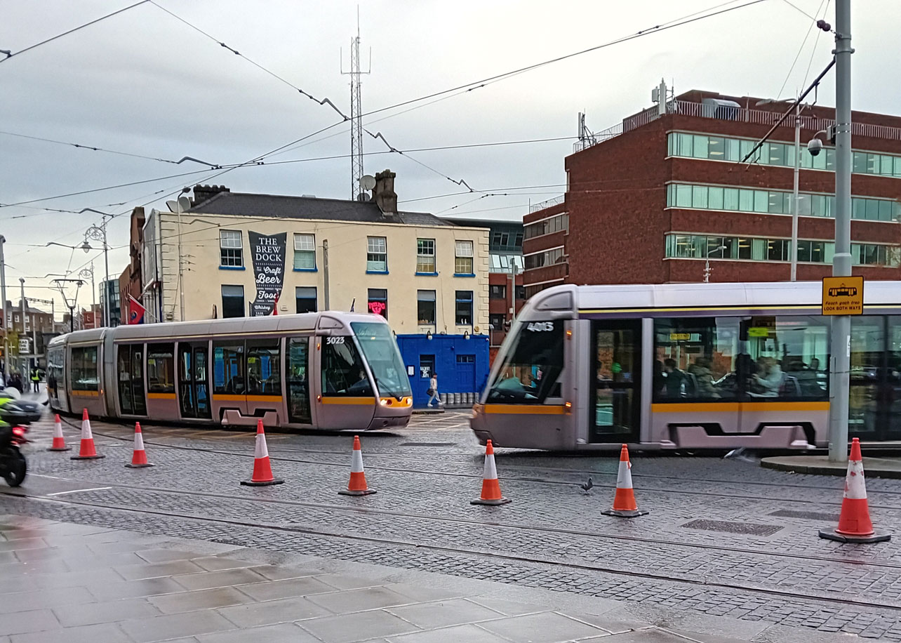 4013 heading for Tallaght on the Red Line crosses the junction with the north bound Green Line at Abbey Street/O’Connell Street. Note the curve from a facing point on the Green Line show signs of recent use.
