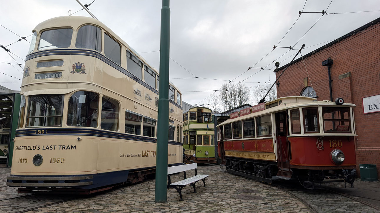 Trams on display in the depot yard including Prague 180 which was making a rare outside appearance. Sheffield 510 is alongside and behind we see one of the most recent tram arrivals at the museum, Wallasey 78.