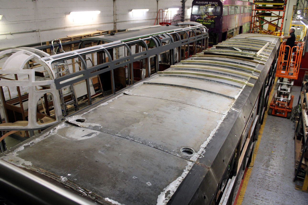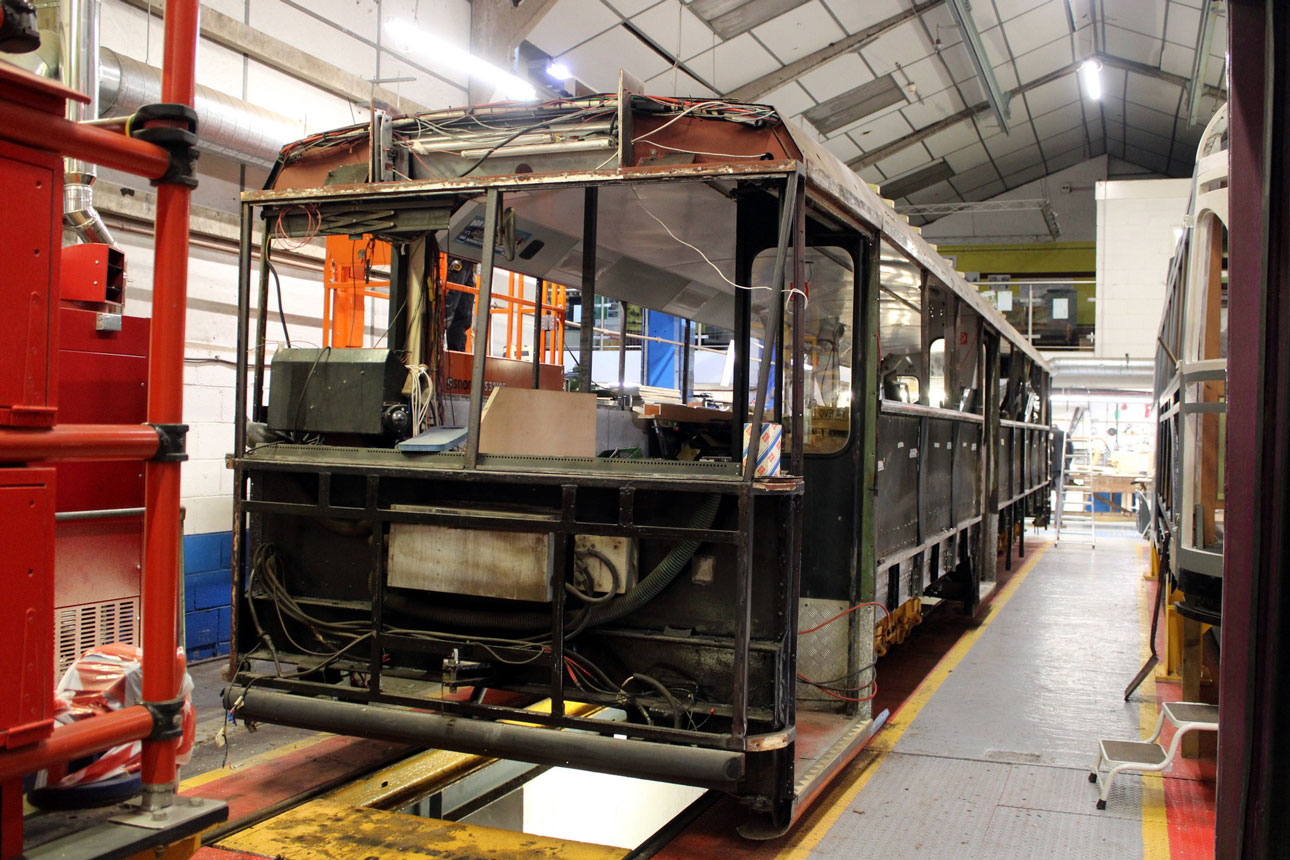 Centenary 645 continues to take shape with much of the exterior panelling now stripped. As part of the work on the tram its planned that it will regain its original style roof ends and destination screens.