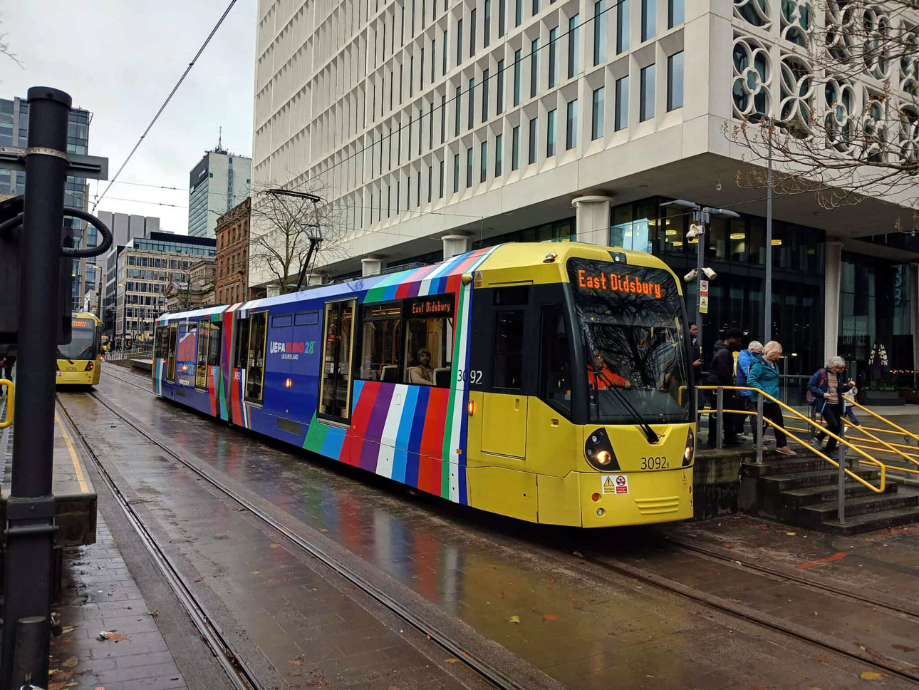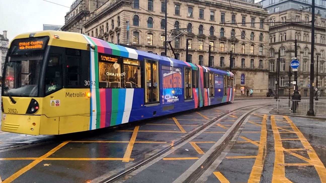 Euro 2028 may (unsurprisingly) still be more than two years away from starting (9th June to 9th July 2028 in case you’re wondering) but that hasn’t stopped vinyls being wrapped on a tram in Manchester to promote the fact that it is a host city. 3092 is the tram which has received the brightly coloured advert, with it being noted in service for the first time on 13th November 2025.