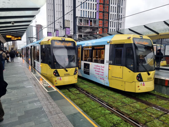 With two trams carrying adverts for Trafford Palazzo the photographers dream is getting the two together – and that was achieved at Deansgate-Castlefield here! 3096 on the left for MediaCityUK and 3089 on the right with a service to The Trafford Centre which will call as its named stop. (All Photographs by Michael Morton, 14th November 2025)