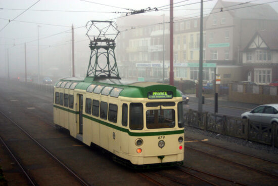 The Old is represented in this image by Ex-Towing Railcoach 679 which is taking a break on the centre track at Bispham. This was during its farewell tour on 29th November 2008 – a foggy and misty day which saw the tram (recently acquired by the then Lancastrian Transport Trust) run along with fellow LTT tram Coronation 304 along the length of the tramway. The luminous writing on the destination blind helps to brighten up the scene with the tram’s 1980s green and cream fleet livery seen through the gloom. The tram remains at Rigby Road Depot with it part-way through a restoration back to its original English Electric Railcoach condition.
