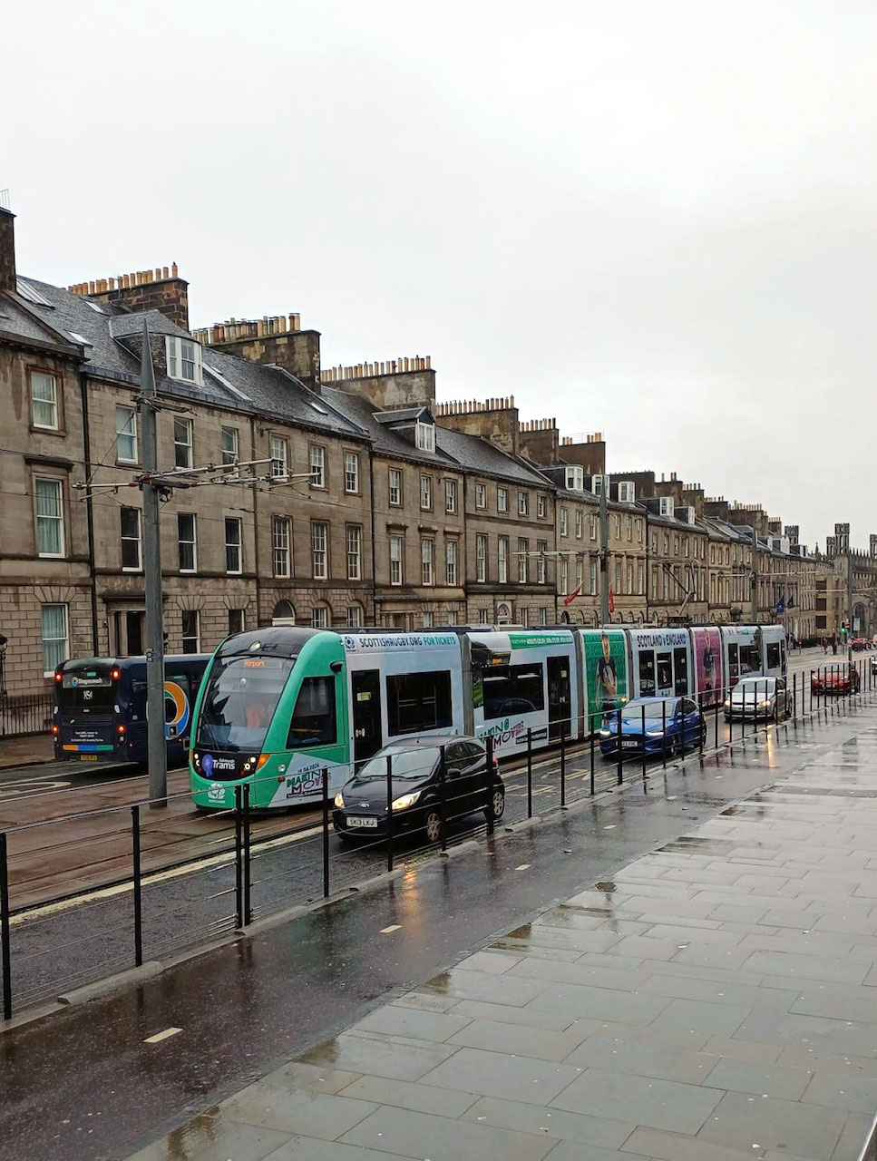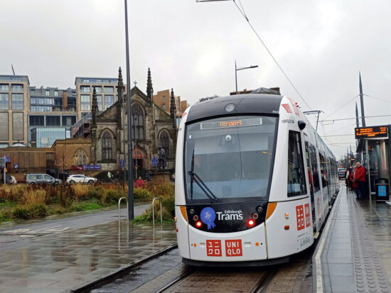 We then see 254 (UniQlo advert) at Picardy Place. It too will be able to take more passengers to rugby with it working another service to the Airport. We take a look at the rear of the tram here with St Mary’s Catholic Cathedral and St James Quarter to the left. (All Photographs by Roy Calderwood, 23rd November 2025)