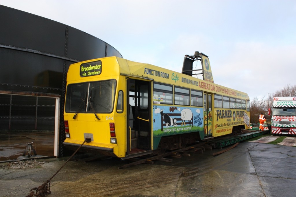 Centenary car 644 seen on arrival at its new home with Farmer Parr in Broadwater. This was the first tram of its kind to leave Blackpool and it's destined for use as a children's play area. (Photo by Andrew Blood)