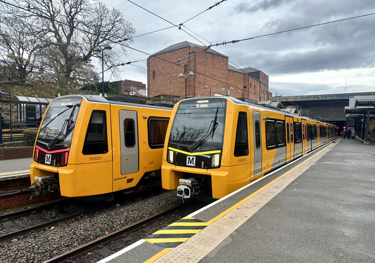 The takeover on the Tyne and Wear Metro by the new trains (built by Stadler in Switzerland) is continuing with the continued withdrawal and move for scrapping of the original trains which have provided service in the northeast for over 40 years. With more and more of the Stadler built trains in service, or on test, scenes such as this have become more regular – new trains side-by-side. Taken at North Shields here we see 555 038 working to St James as it passes 555 021 which is out of service and being used on test/training. (Photograph by Simon Robinson, 27th November 2025)