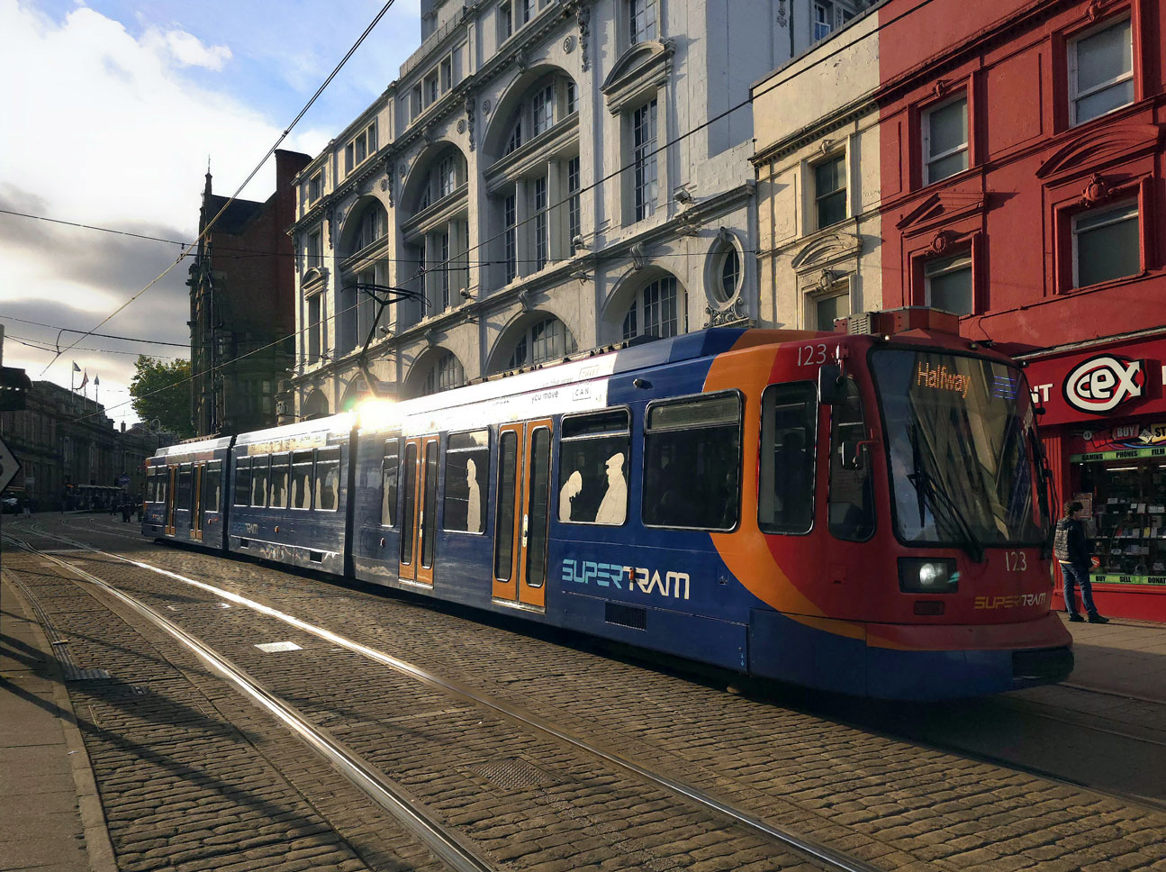 There is some early autumn sunshine which reflects off the side of 123 as it works a Malin Bridge to Halfway service on 9th October 2025. The tram received special window vinyls in 2015 to mark the 21st anniversary of the Supertram system with artwork by local artist Pete McKee and they have remained in place ever since! The tram has just left Cathedral. (Photograph by John Binch, 9th October 2025)