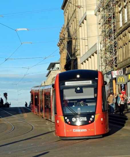 You don’t have to wait long in Edinburgh before you see a tram carrying the red full wrap for Emirates and that was the case when the photographer was waiting at the bottom of South Saint Andrew Street. 258 is just turning into Princes Street on its way to the Airport with the sunshine needing the driver to keep the blind down to ensure they can see the way ahead. (Photograph by Roy Calderwood, 20th December 2025)