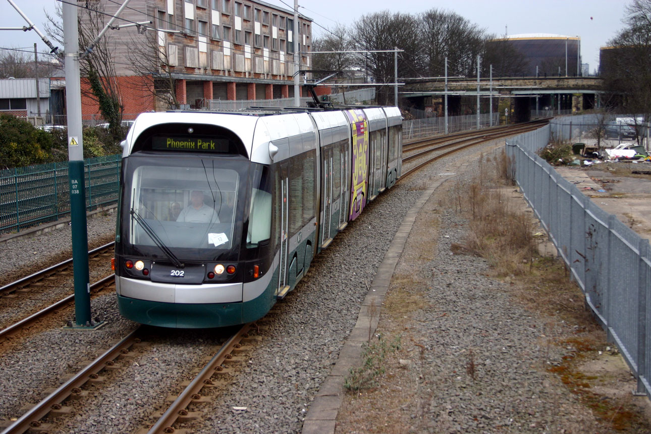 Nottingham Express Transit Incentro 202 was one of 15 trams built by Bombardier at their Derby plant (or assembled as is more the case) for the opening of the original system in March 2004. Like all of these trams it has undergone two mid-life refurbishments but when captured on camera on 11th March 2010 it was still in the original fleet livery which tells us that it hadn’t yet received that work. The tram is seen here approaching Basford with a service to Phoenix Park – at this time it would have come from the original Station Street terminus.