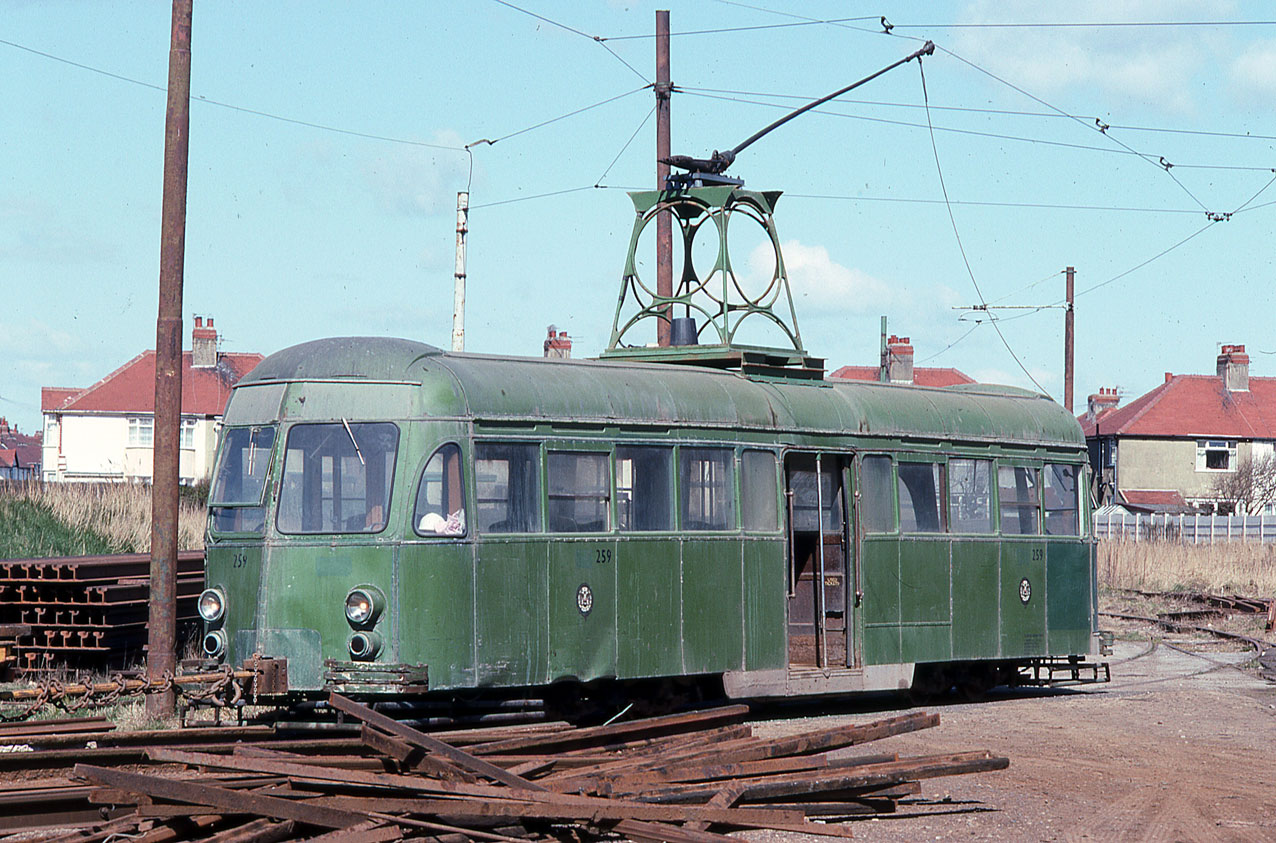 Taken at Thornton Gate Permanent Way yard on 14th April 1994 we see Works Brush 259 which was being used (with a trailer out of sight) in moving replacement rails along the tramway. 259 – now owned by the Fylde Transport Trust – started off life as Brush Railcoach 287 before being converted into a Works Car in 1971. It went through several numbers as a Works Car and would remain operational until 2002 when it was taken out of use and stored for the then LTT. It can currently be found stored in Rigby Road Depot.