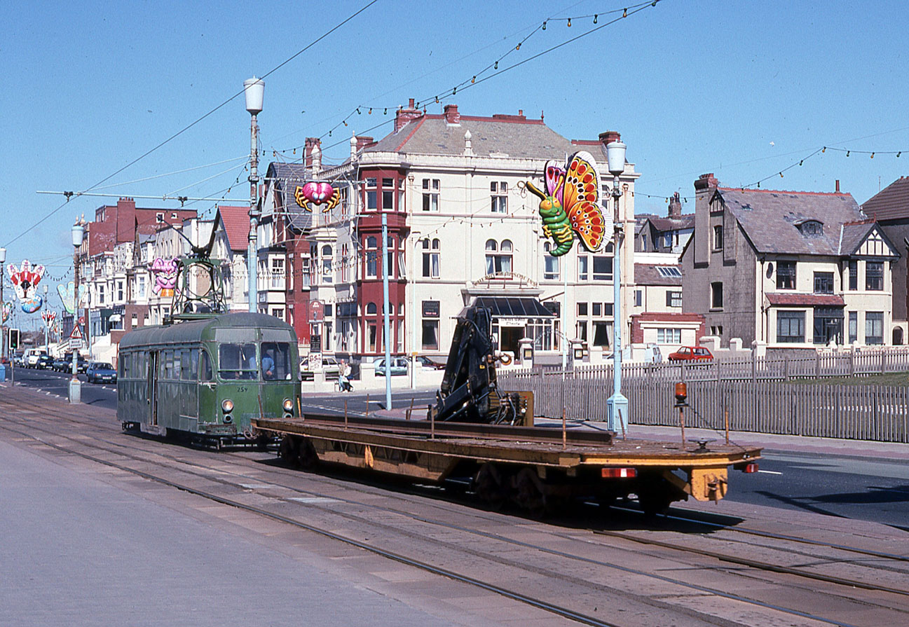 Last week we saw Works Brush 259 in Thornton Gate Permanent Way Yard and this photo is taken on the same day, 14th April 1994, as the tram goes along North Promenade heading south at Warley Road. The tram is actually propelling Rail Crane 260 which is fitted with a crane. There is also a length of rail on the trailer in this shot.