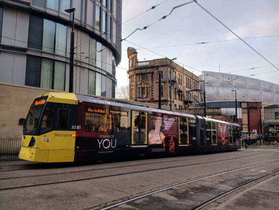 Manchester Metrolink 3081 being back in fleet livery didn’t last long as just a week later its been wrapped in new advertising vinyls. This time round it’s a cleaner advert with it now promoting the new Armani Power of You fragrance.