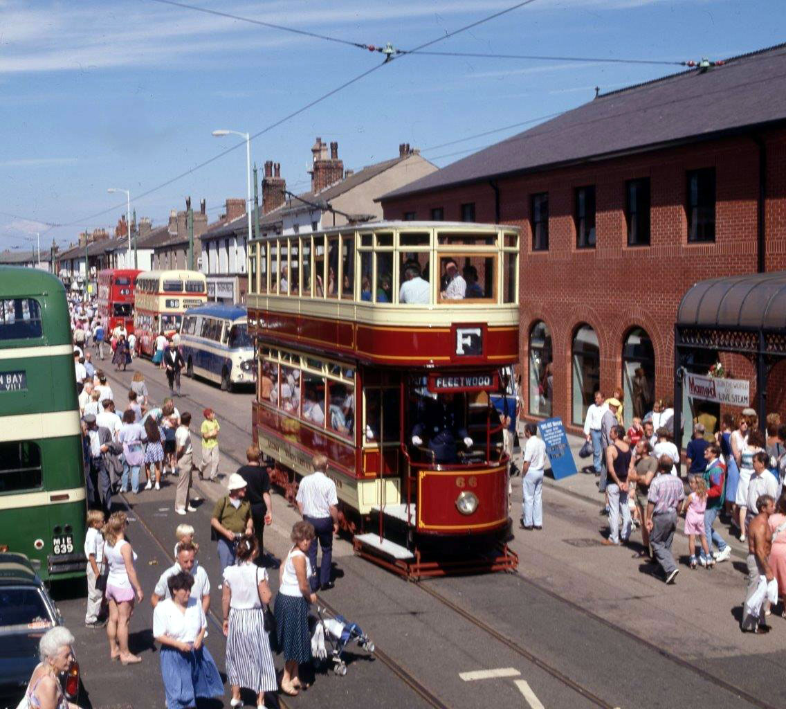 This photo shows Bolton 66 running along North Albert Street and passing Fleetwood Library. The library building was still pretty new at the time of this image with it opening in 1988, just the year previous to this image being captured. The location that the tram is passing is the site of where the modern day Victoria Street tramstop is found.