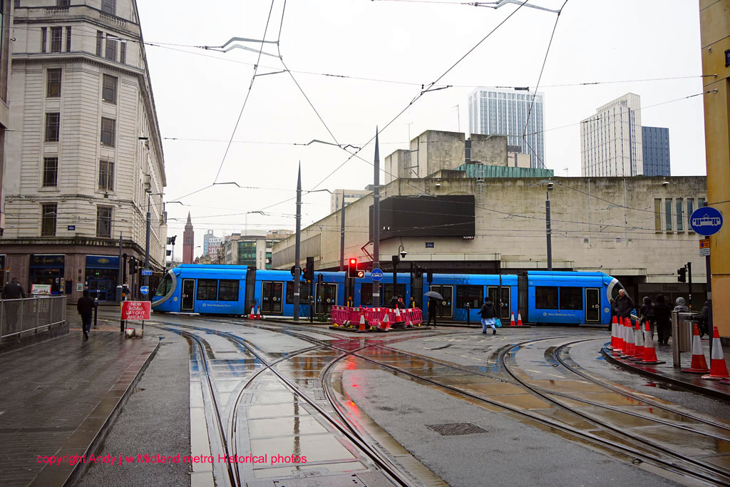 The Corporation Street/Bull Street delta junction with 20 on the track leading between Bull Street and Lower Bull Street onto the extension. Corporation Street and the line towards Edgbaston Village is in the foreground.