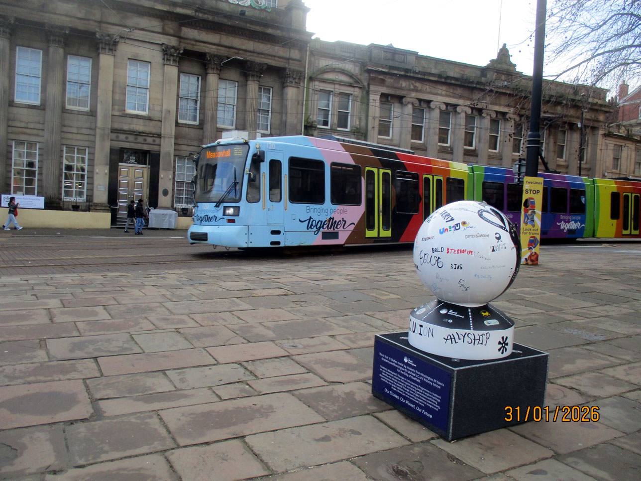 When a tram network has been open for over 30 years it often becomes a bit of a struggle to capture different images so when there is an art trail it soon offers good opportunities. One such occurrence is currently outside Sheffield Cathedral where 10 globes – created by artists and Doncaster schools – known as “The World Reimagined” can currently be seen. This particular globe aims for inclusion and allyship. Beyond the globe we see 120 which also is all about inclusion carrying the “Bringing People Together” livery. (Photograph by Stuart Cooke, 31st January 2026)