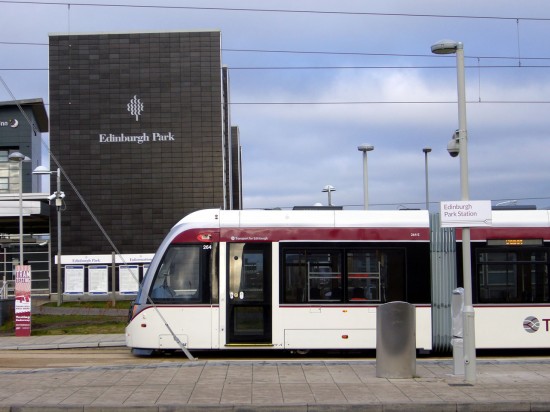 264 at Edinburgh Park tramstop. The building behind the tram is the mainline railway station.
