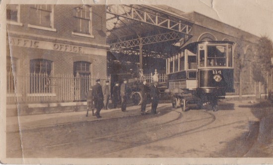 I beleive this could be Portsmouth Corporation car 114 being delivered in November 1920, cars 105 – 116 were built by English Electric. The cars were delivered by rail to Cosham goods yard and unloaded, the upper and lower deck bodies were taken by road whilst the trucks were towed to the depot by works car. The cars were assembled in the works which were adjacent to the depot at Glady Ave, North End. the car ran until 1936 when the tramway was closed. This building has now been demolished.