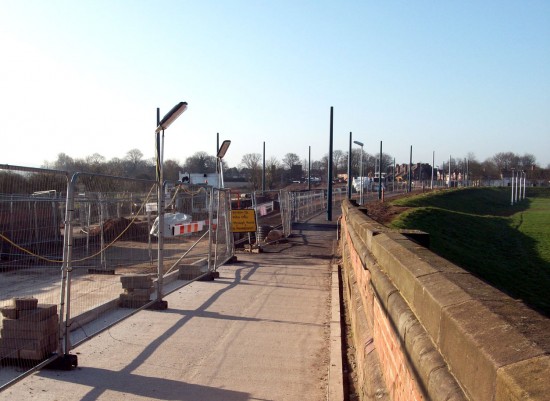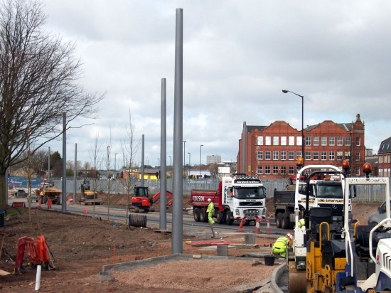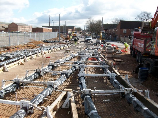 Construction work on Phase Two of Nottingham Express Transit has gathered pace in the last few weeks with seven day a week working now in evidence. Traction poles are now up in several places including Chillwell, Wilford Riverside and Meadows Way/Arkwright Street. The point work for the junction of the two routes is now being laid and most of the track has now been laid on the Station bridge and ramp. With thanks to David Beardsell we are able to bring you photographic updates of some of the recent progress.