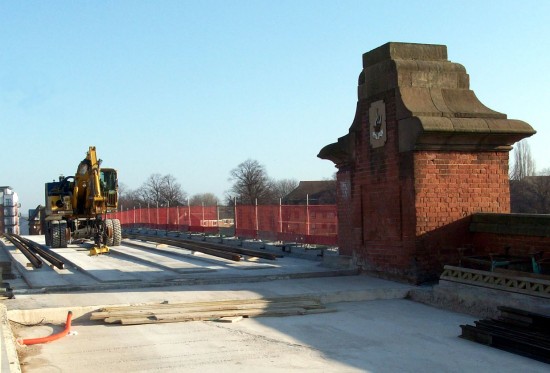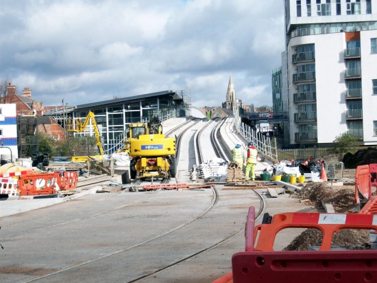 A view showing Station Street stop in the distance with track laying now reaching a conclusion on the Karlsruhe Friendship Bridge taking the trams over the railway station.
