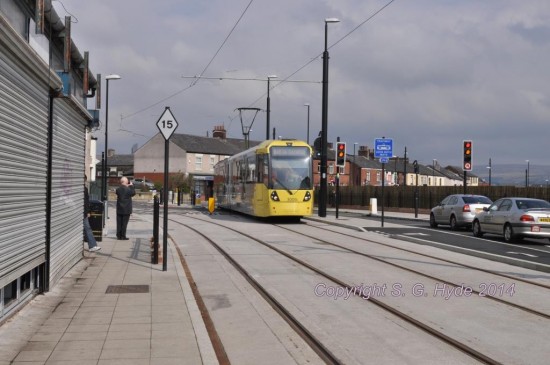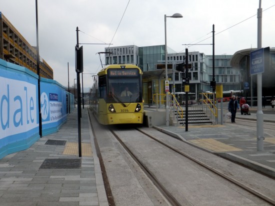Thursday 27th March saw the first of four planned days of shadow running in Rochdale town centre ahead of the opening of the line to the public on Monday 31st March. As with previous shadow running on Manchester Metrolink the LRVs are running in service as far as the current terminus of Rochdale Railway Station where all passengers have to alight before the vehicle continues its journey into Rochdale town centre.