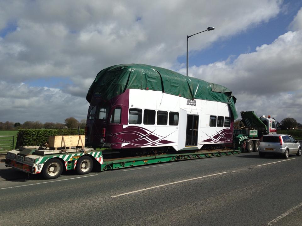 Another view of 711 on the Scotts Heavy Haulage transporter, clearly showing the sheeting used to protect its upper deck from being damaged in transit.