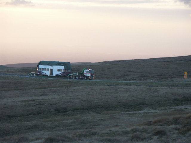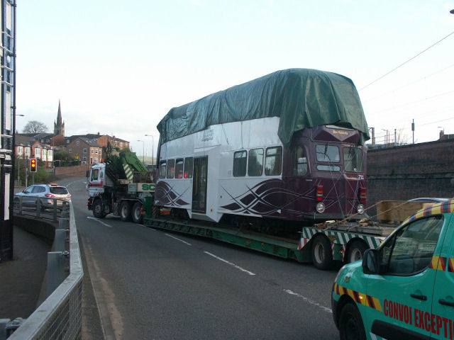 A very unusual sight in Macclesfield on the evening of April 8th, as Blackpool 711 makes its way through the town on the back of a Scotts low loader.