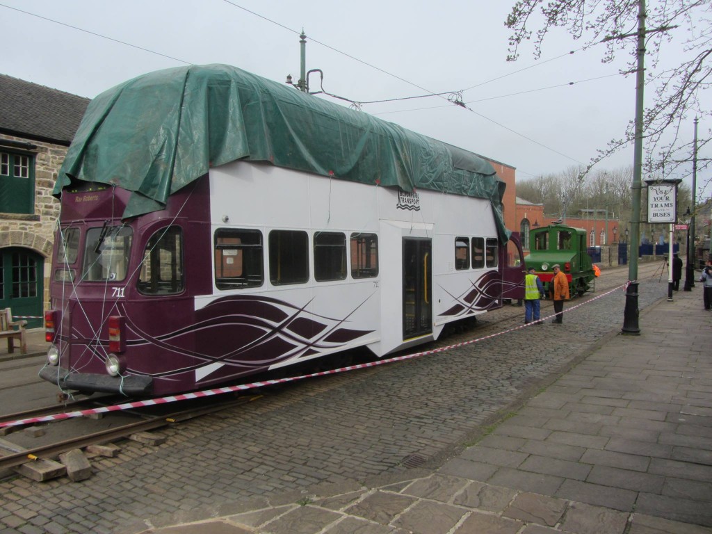 As is usual practice for double-deck trams due to the lower overhead wires in the depot yard, 711 was unloaded from the Scotts Heavy Haulage lorry which had transported it from Blackpool in the period street. The Blackpool electric locomotive – a tram which 711 wouldn’t have met since the 1960s, if at all – was then summoned and coupled up to the Balloon car, which was moved to the depot area to be checked over. There, the protective sheeting will be removed and the tram will presumably receive a heavy clean in readiness for service. Once the usual process of commissioning, crew training and risk assessments has been completed the tram should be released to traffic and although no definite date has been given, the car is expected to be one of the star attractions at the upcoming ‘Beside the Seaside’ event in late May alongside Jubilee car 762, showcasing more recent developments on the Blackpool tramway alongside the other more traditional cars in the collection.