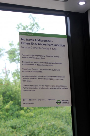 London Tramlink services to Elmers End and Beckenham Junction will be suspended between Saturday 24th May and Sunday 1st June to allow for the replacement of the road bridge at Spring Lane, Woodside. During this period trams from Therapia Lane and West Croydon will terminate at Addiscombe with a replacement bus service being provided between Beckenham Junction and East Croydon calling as close as possible to most trams stops. Trams on Line 1 between Wimbledon and New Addington will be unaffected and will be able to operate a normal service.