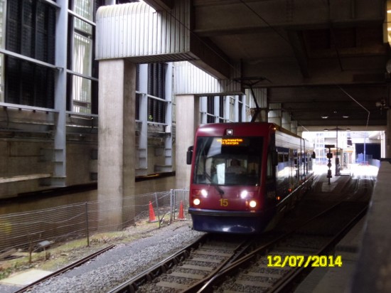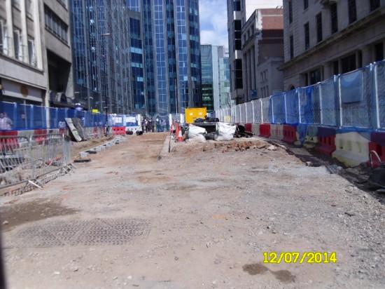 Progress is continuing on the Birmingham City Centre extension of Midland Metro which is due to open during 2015. The extension will leave the current Metro line just before Snow Hill railway station before travelling on a new viaduct and then down to street level. The line will travel along Upper Bull Street, Corporation Street before terminating at Stephenson Street outside New Street station. Recent photos of the current state of affairs on this extension are shown below courtesy of Ken Jones.