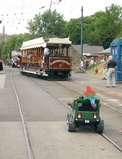 Over the weekend of Saturday 12th and Sunday 13th July the Crich Tramway Village held another special event with an Edwardian Weekend. A regular tram service operated over both days which included horse tram Sheffield 15 on the Sunday with other trams such as Blackpool & Fleetwood 2, Blackpool 40, Sheffield 74, London United Tramways 159 and Glasgow 1068 also seeing use during the weekend. On top of the trams there were also plenty of other Edwardian activities including re-enactors. Woodies Wings – a parrot and owl rescue centre – were also on site with one of their Parrots taking a ride on board a remote controlled car! Photos below have been provided to British Trams Online by Hazel Quarmby.