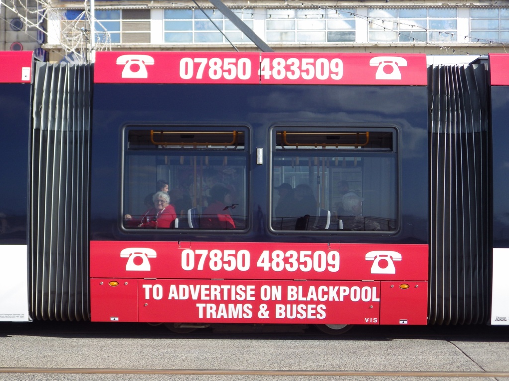 014 has recently shed its adverts for the Pleasure Beach itself, featuring images of the famous ‘Big One’ rollercoaster on both sides, in favour of bright red posters advertising the chance to advertise on a Blackpool tram! This also seems to highlight the apparent shortage of new sponsors coming forward to take the place of the disapearing Pleasure Beach branding once carried by several of the fleet.