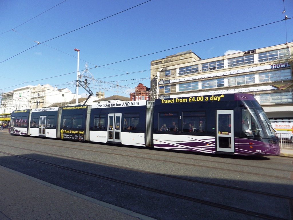 Meanwhile, 015 has also lost its advertising for the Nickelodeon Land attraction and these have been replaced by a new black design promoting Blackpool Transport’s own range of ‘1tickets’. This is effectively today’s equivalent of the old Travelcards, and the new advert is appropriate in co-inciding with the re-launch of Balloon 701 whose red and white livery was originally used as a background for tasteful Travelcard advert banners. Both of the Flexity trams carry these new slogans on the central side panels and on the roof sides, with no intrustive window vinyls employed.