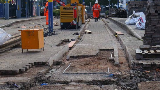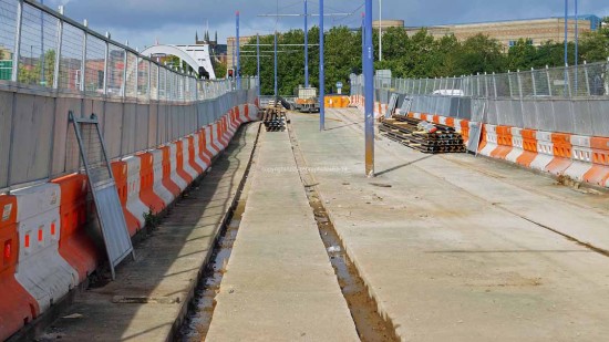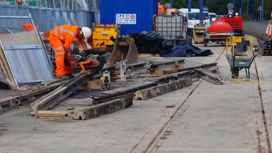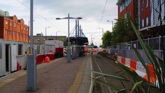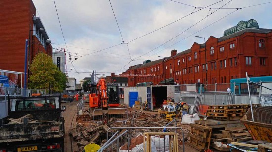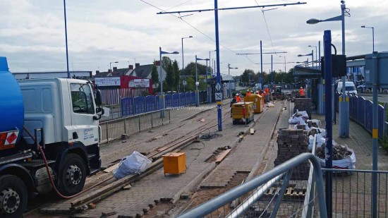 Although recently our concentration on Midland Metro has been with the departure of the T69 trams there is also the not too insignificant matter of the rail replacement works between The Royal and Wolverhampton St George’s. The line beyond Priestfield was closed to trams from Saturday 6th September and during this time fairly good progress has been made on replacing the track at both stops and along Bilston Road. It is still hoped that the works at The Royal will be completed ahead of the full 12 week closure so that trams can be extended to there but no date has yet been set for a partial reopening. Photos courtesy of Andy Walters, all taken on 1st October 2014.