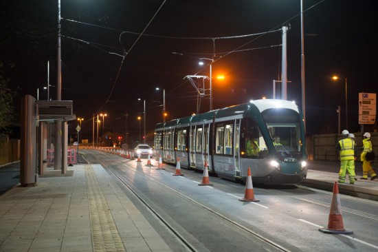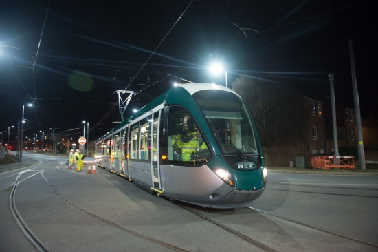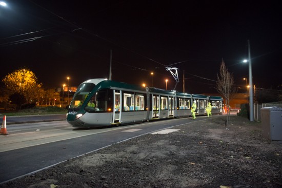 Early on the morning of Wednesday 3rd December a significant step was taken in the testing and commissioning of Nottingham Express Transit’s Phase Two line to Beeston and Chilwell with the first test runs of a tram as far as ng2. Although only a small part of the final route (ng2 is two stops from Nottingham Railway Station) the significance of these test runs should not be underestimated and will hopefully signify the start of a major period of testing and commissioning of the route ahead of its opening during 2015.