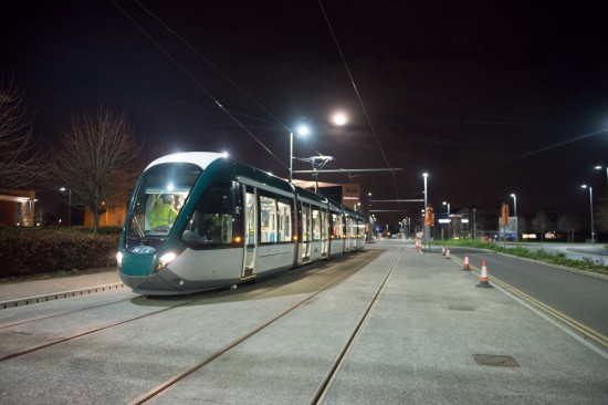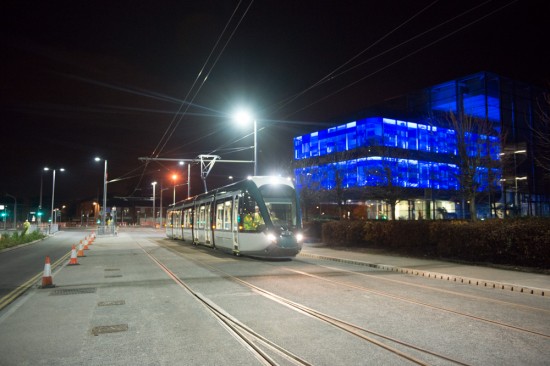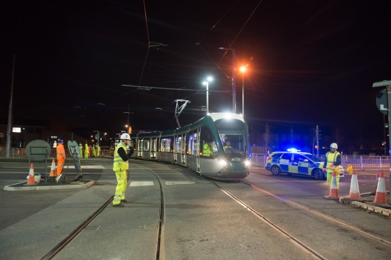 Citadis 223 – which has yet to answer passenger service – was the vehicle chosen to undertake the test runs and it was just after midnight when it made its way past the temporary buffer stops at Station Street and then onto the Karlsruhe Friendship Bridge. Previously any tests onto Phase Two had run onto the Clifton route but this time when 223 got to the junction between the two lines it accessed the Chilwell line becoming the very first tram to run on this section of track. During the early hours of the morning the tram made four runs as far as ng2 (passing the stop at Meadows Way West) initially run at 5kph to ensure everything was as it should be before gradually increasing to line speed. This is just the first stage of a comprehensive testing and commissioning process on the line which should gradually increase over the coming months, especially now that the trackwork has been completed on the line to Chilwell (with the Clifton line also expected to be finished soon).