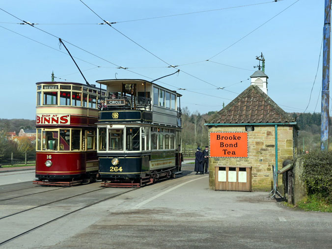 The only standard gauge heritage tramway in the UK which runs throughout the year is that at Beamish where the trams cover some of the highest mileage of all as they go round and round the circular tramway. On 20th March 2026 there were two trams in service at the museum and this image shows both of them passing at the Pockerley tramstop. On the left is Sunderland 16 and it is joined by Sheffield 264.