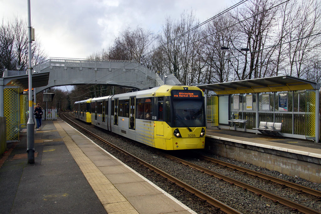 Staying at Bowker Vale here we see 3058 leading a double unit into the stop as it works a Bury to Altrincham direct service.