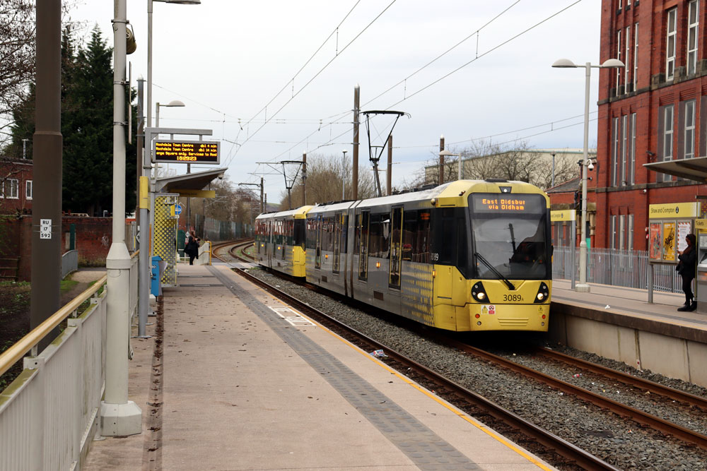 Shaw and Crompton is usually a stop which has a tram every 6 minutes into Manchester City Centre and beyond but the intermediate terminating service is currently not running this far so its just the basic 12 minute frequency at the moment. 3089+3119 arrive with a service to East Didsbury.