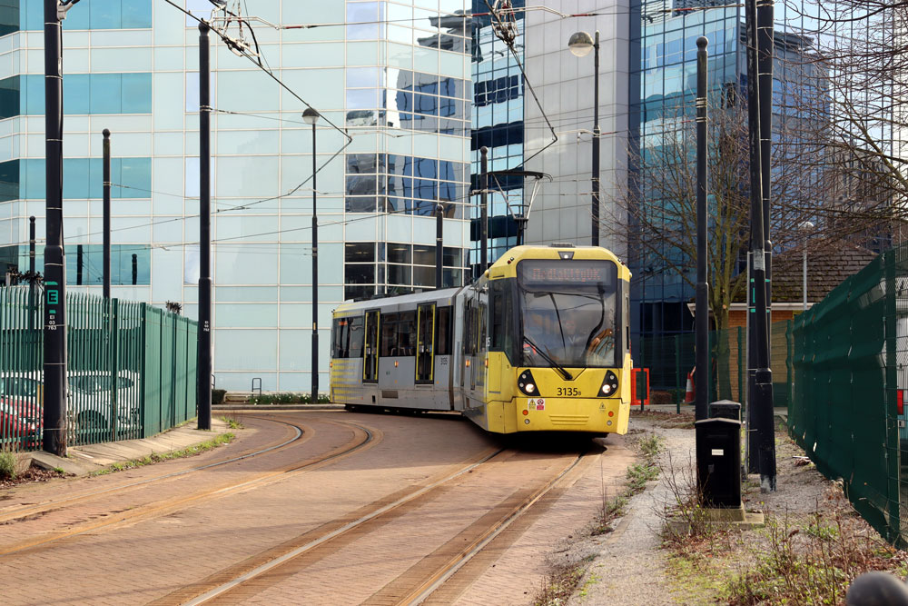 3135 approaches Exchange Quay. On 19th March the tram was on the Etihad Campus to MediaCityUK service.