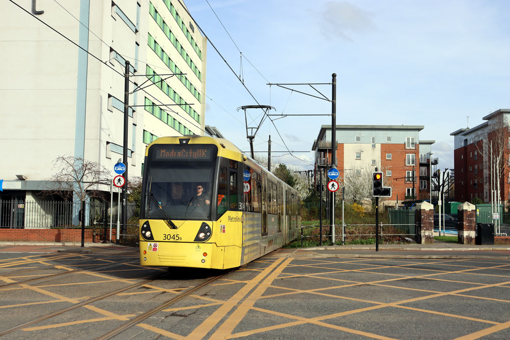 Here we see 3045 on the approach to Salford Quays with a service to MediaCityUK.
