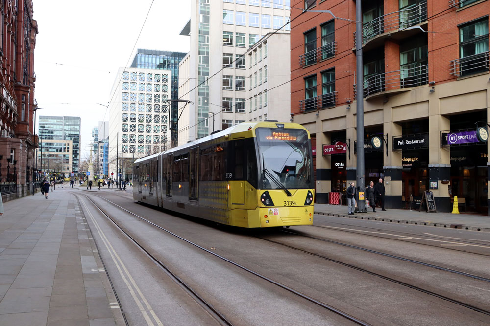 On Lower Mosley Street we see 3139 which is working a service to Ashton-under-Lyne.