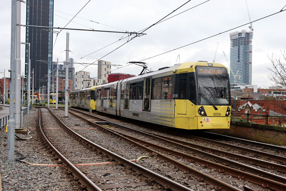 3059+3001 have just departed from Deansgate Castlefield whilst working to MediaCityUK.