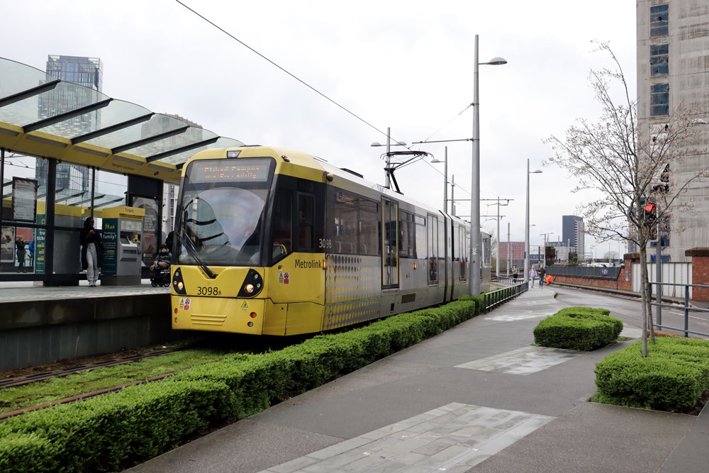 3098 at Deansgate Castlefield with a service for Etihad Campus.